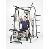 The Marcy Diamond Elite Smith System features ultra smooth linear bearings combined with machined steel guide rods that assure a super smooth movement. The 2″ x 2 3/4″ heavy duty tubular steel frame features a 7-degree slant designed to accommodate the natural upper and lower body movements. Other key features include: Durable Powder coated finish. 3 3/4″ nylon pulleys with sealed ball bearings. 2000 lbs tensile strength aircraft cable. Commercial grade pop pins adjustment. Chrome striker plates and commercial grade bar and safety catches. 6 Olympic plate storage pegs. Full compliment of accessories. The unit includes a quality multi-function bench with preacher curl and leg developer. Get the most out of your workout with the Marcy Diamond Elite Smith System.